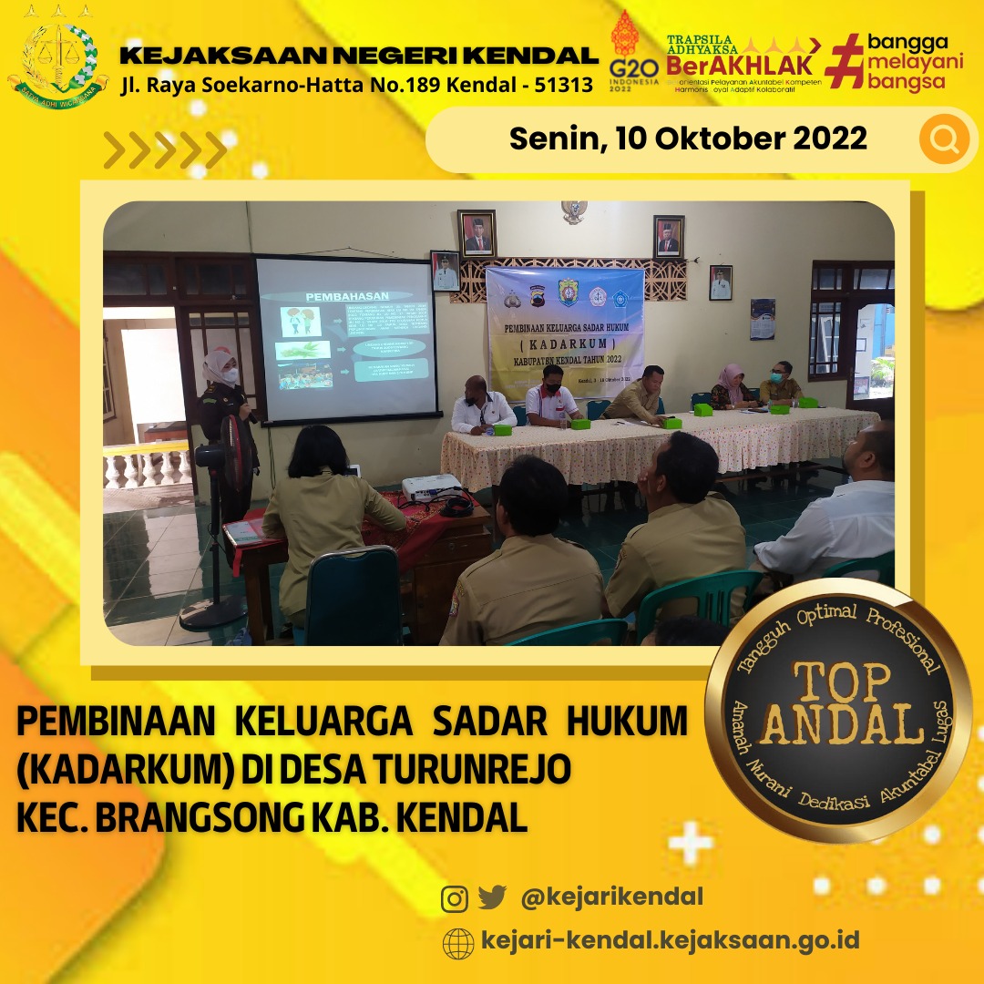 Pada hari Senin tanggal 10 Oktober 2022 pukul 09.00 WIB bertempat di Aula Balai Desa Turunrejo Kecamatan Brangsong Kabupaten Kendal, Kepala Sub Bagian Pembinaan Citra Yulia Fitrianingsih, S.H., M.H. hadir sebagai narasumber Pembinaan Keluarga Sadar Hukum (KADARKUM).