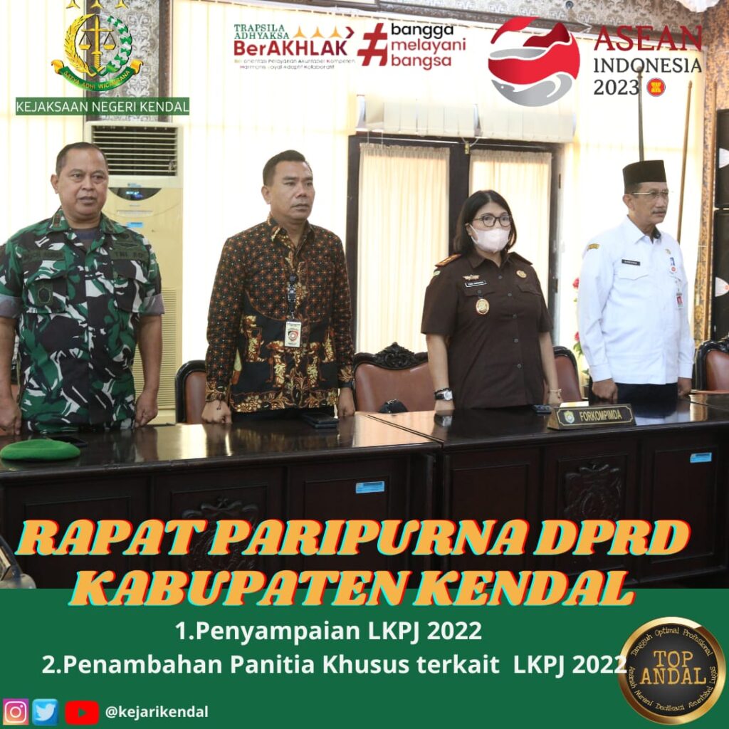Pada hari ini Rabu tanggal 29 Maret 2023 pukul 10.30 wib bertempat di ruang Rapat Paripurna DPRD Kepala Kejaksaan Negeri Kendal (Erny Veronica Maramba,SH.M.Hum) beserta Kepala Seksi Intelijen Kejaksaan Negeri Kendal (Langgeng Prabowo,SH) mengikuti Rapat Paripurna DPRD Kabupaten Kendal dalam rangka: