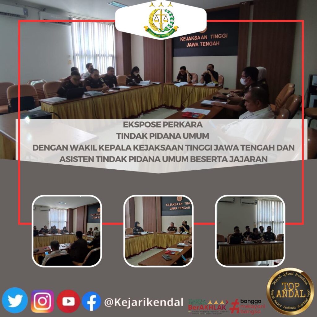 Pada hari Kamis, 30 Maret 2023 pukul 14.00 Wib Bertempat di Kejaksaan Tinggi Jawa Tengah Kepala Kejaksaan Negeri Kendal Erny Veronica Maramba S.H.,M.Hum dan didampingi Kepala Seksi Tindak Pidana Umum Budi Sulistyo S.H.,M.H. Beserta Kasubsi pada Kejaksaan Negeri Kendal Telah melaksanakan Ekpose Tindak Pidana Umum dengan Wakil Kepala Kejaksaan Tinggi Jawa Tengah, Asisten Tindak Pidana Umum beserta Jajaran.