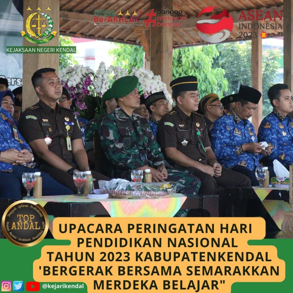Pada hari ini Selasa tanggal 2 Mei 2023 Pukul 07.00 WIB bertempat di Generasi Penerus Nusantara Boarding School (GNBS) Kebonadem Kecamatan Brangsong Kabupaten Kendal, Kepala Seksi Intelijen Kejaksaan Negeri Kendal Langgeng Prabowo, SH dan Kepala Seksi Perdata dan Tata Usaha Negara Kejaksaan Negeri Kendal Baladika Surengpati,SH mewakili Kepala Kejaksaan Negeri Kendal mengikuti Upacara Peringatan Hari Pendidikan Nasional Tahun 2023 Kab.Kendal ”BERGERAK BERSAMA SEMARAKKAN MERDEKA BELAJAR”