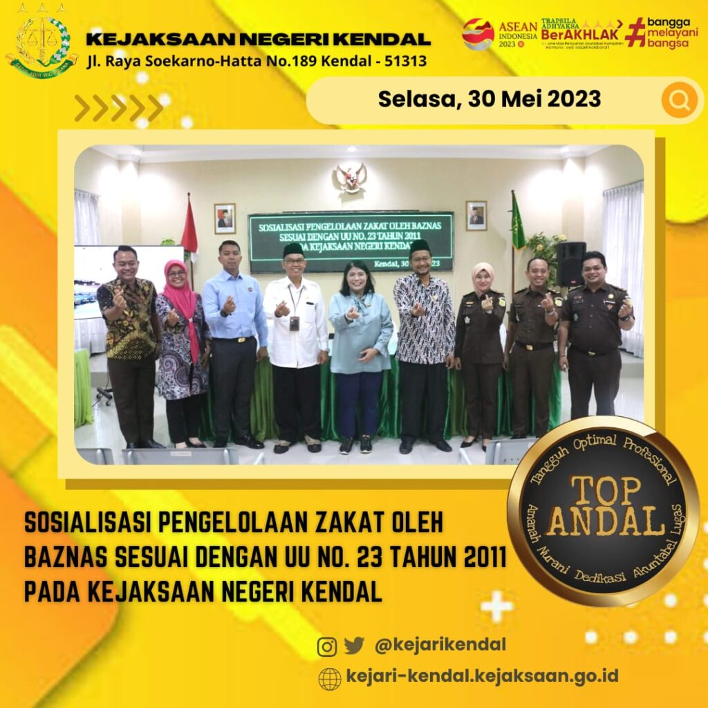 Pada hari Selasa tanggal 30 Mei 2023 pukul 11.00 WIB bertempat di Aula Kejaksaan Negeri Kendal, telah dilaksanakan Sosialisasi Pengelolaan Zakat sesuai dengan UU No. 23 Tahun 2011 tentang Pengelolaan Zakat oleh Baznas Kabupaten Kendal dan diikuti Pegawai dan PPNPN Kejaksaan Negeri Kendal.