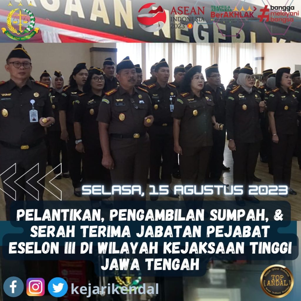 elasa, 15 Agustus 2023, pukul 08.00 WIB, Kepala Kejaksaan Negeri Kendal Erny Veronica Maramba, S.H.,M.Hum. Mengikuti Pelaksanaa Pelantikan, Pengambilan Sumpah,dan Serah Terima Jabatan Pejabat Eselon IlI di Wilayah Kejaksaan Tinggi Jawa Tengah.