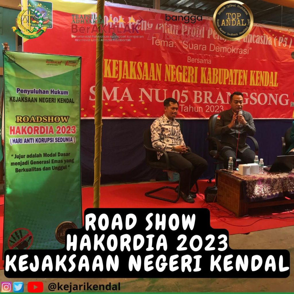 Roadshow Kejaksaan Negeri Kendal dalam Rangka HAKORDIA (Hari Anti Korupsi Sedunia) Tahun 2023 “Jujur adalah Modal Dasar menjadi Generasi Emas yang Berkualitas dan Unggul”, Kepala Seksi Intelijen Kejaksaan Negeri Kendal Langgeng Prabowo, S.H. dan Kepala Sub Seksi Ipolsosbudhankam Kejaksaan Negeri Kendal Arga Indra Irawan, S.H. menjadi Narasumber Pada kegiatan Projek Penguatan Profil Pelajar Pancasila (P5) SMA NU 05 Brangsong Kab. Kendal dengan tema “Suara Demokrasi” bertempat di halaman SMA NU 05 Brangsong Kab. Kendal Rabu 15/11/2023 pukul 08.30 WIB dan kegiatan ini merupakan Roadshow yang ke-4