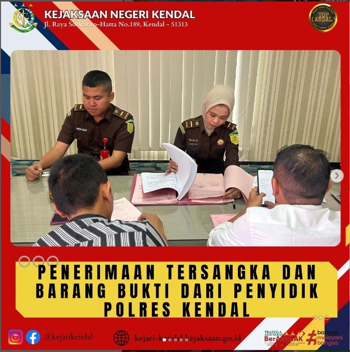 Pada hari Selasa tanggal 08 Oktober 2024, Kejaksaan Negeri Kendal menerima pelimpahan Tersangka dan Barang Bukti dari penyidik Kepolisian Resor Kendal dan diperiksa oleh Jaksa Penuntut Umum Novita Nugraheni Sembodo, S.H. serta didampingi staf Barang Bukti atas nama tersangka ANGGI KRISTIAN NAINGGOLAN Bin BURHAN NAINGGOLAN yang disangka pertama melanggar Pasal 374 KUH Pidana atau kedua melanggar Pasal 372 KUH Pidana dalam perkara Penggelapan.