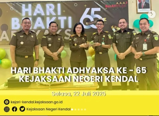 Pada hari Selasa, tanggal 22 Juli 2025 pukul 09.30 WIB, Kepala Kejaksaan Negeri Kendal, Lila Nasution, S.H., M.Hum., memimpin acara tasyakuran dan bakti sosial yang diikuti oleh seluruh pegawai dan pegawai lainnya dalam rangka peringatan Hari Bhakti Adhyaksa ke-65 Tahun 2025.