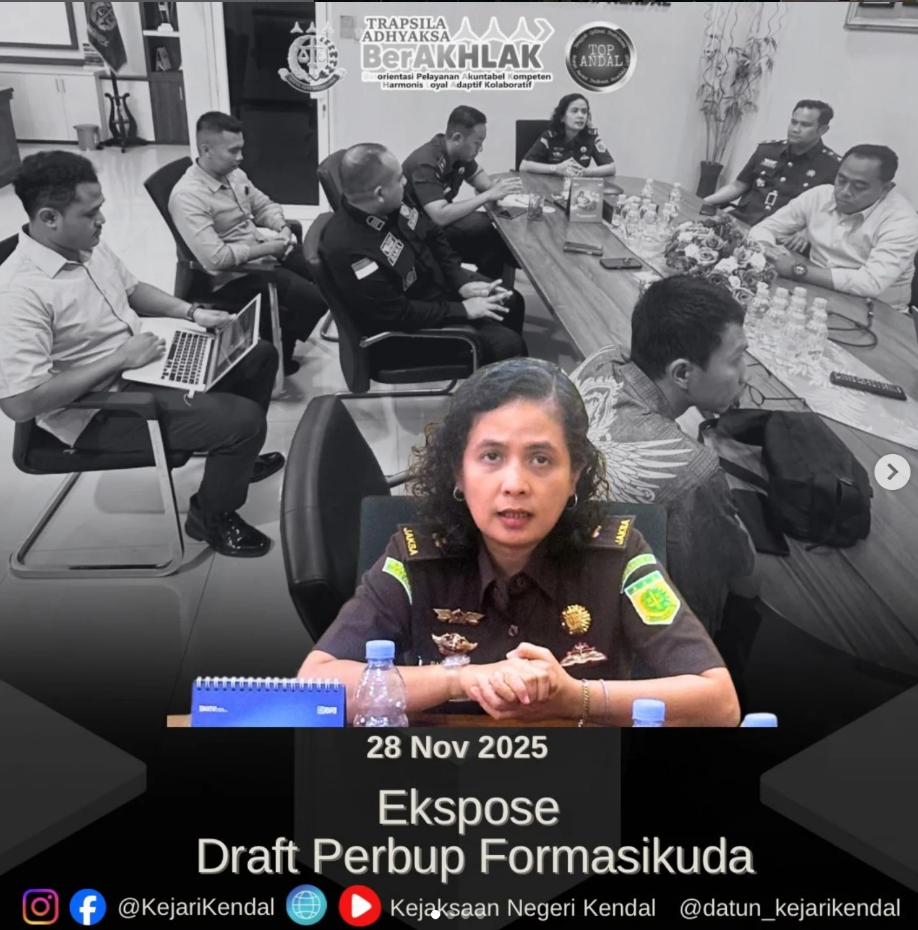 Pada hari Selasa, 28 Oktober 2025 sekira pukul 10.00 WIB, bertempat di Ruang Kerja Kajari Kendal, Plh. Kepala Kejaksaan Negeri Kendal Dr. Rara Ayu, bersama para Pejabat Utama, dan Jaksa Pengacara Negara, melaksanakan ekspose draft Perbup Formasikuda (Forum Kolaborasi Hukum Daerah) Kabupaten Kendal.