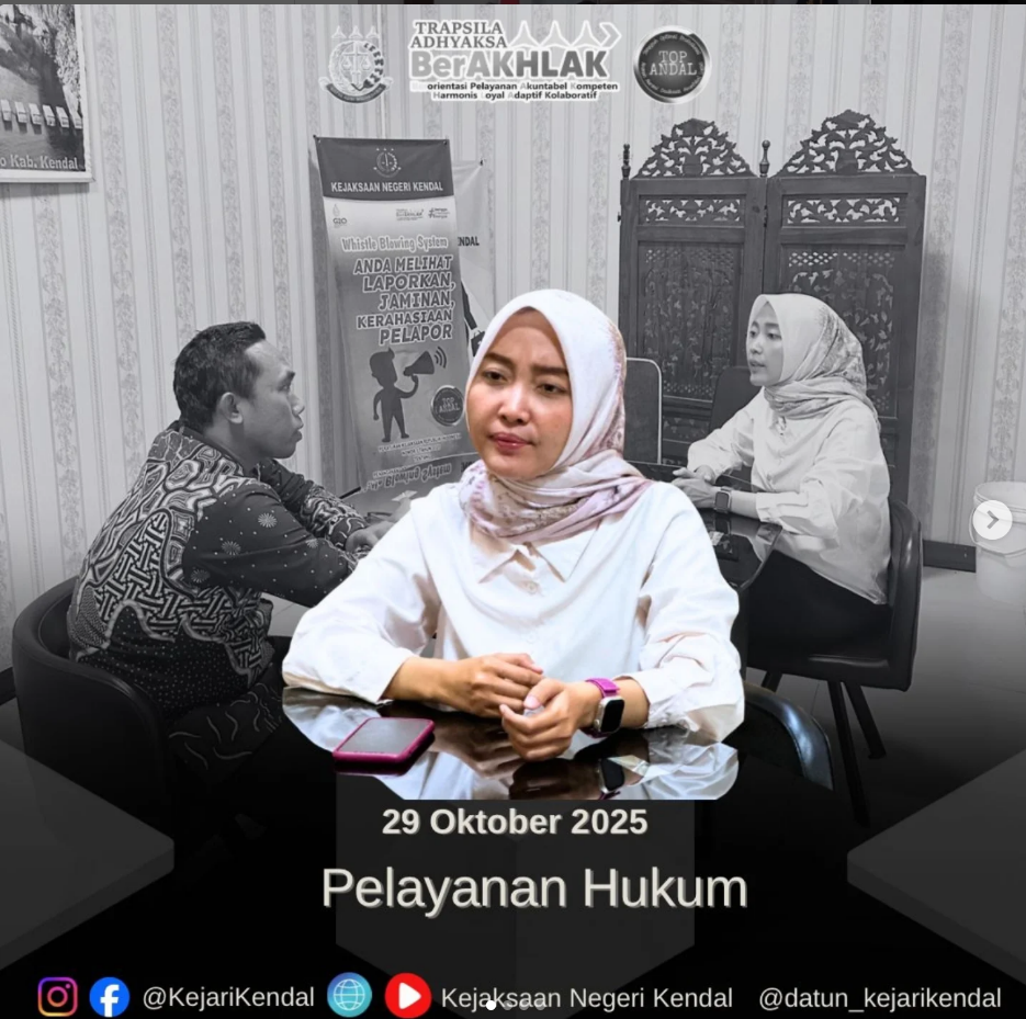 Pada hari Rabu, 29 Oktober 2025 sekira pukul 09.00 WIB, bertempat di Ruang Koordinasi dan Konsultasi, Kasubsi Pertimbangan Hukum Reni Savira Utami, S.H., melaksanakan Pelayanan Hukum Gratis untuk masyarakat Kabupaten Kendal.