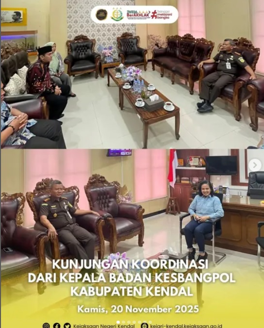 Pada hari Kamis, 20 November 2025 pukul 15.30 WIB bertempat di Ruang Kerja Kajari Kendal, Kepala Kejaksaan Negeri Kendal Dr. Ahmad Hajar Zunaidi, S.H., M.H., didampingi oleh Kasi Datun Dr. Rara Ayu menerima Kunjungan dari Kepala Badan Kesatuan Bangsa dan Politik Kabupaten Kendal.